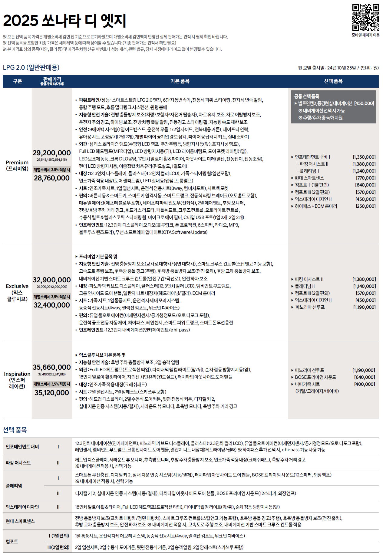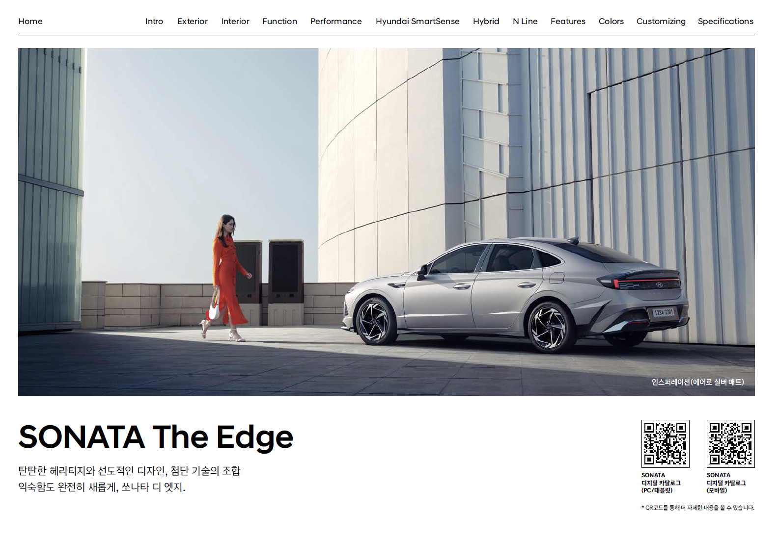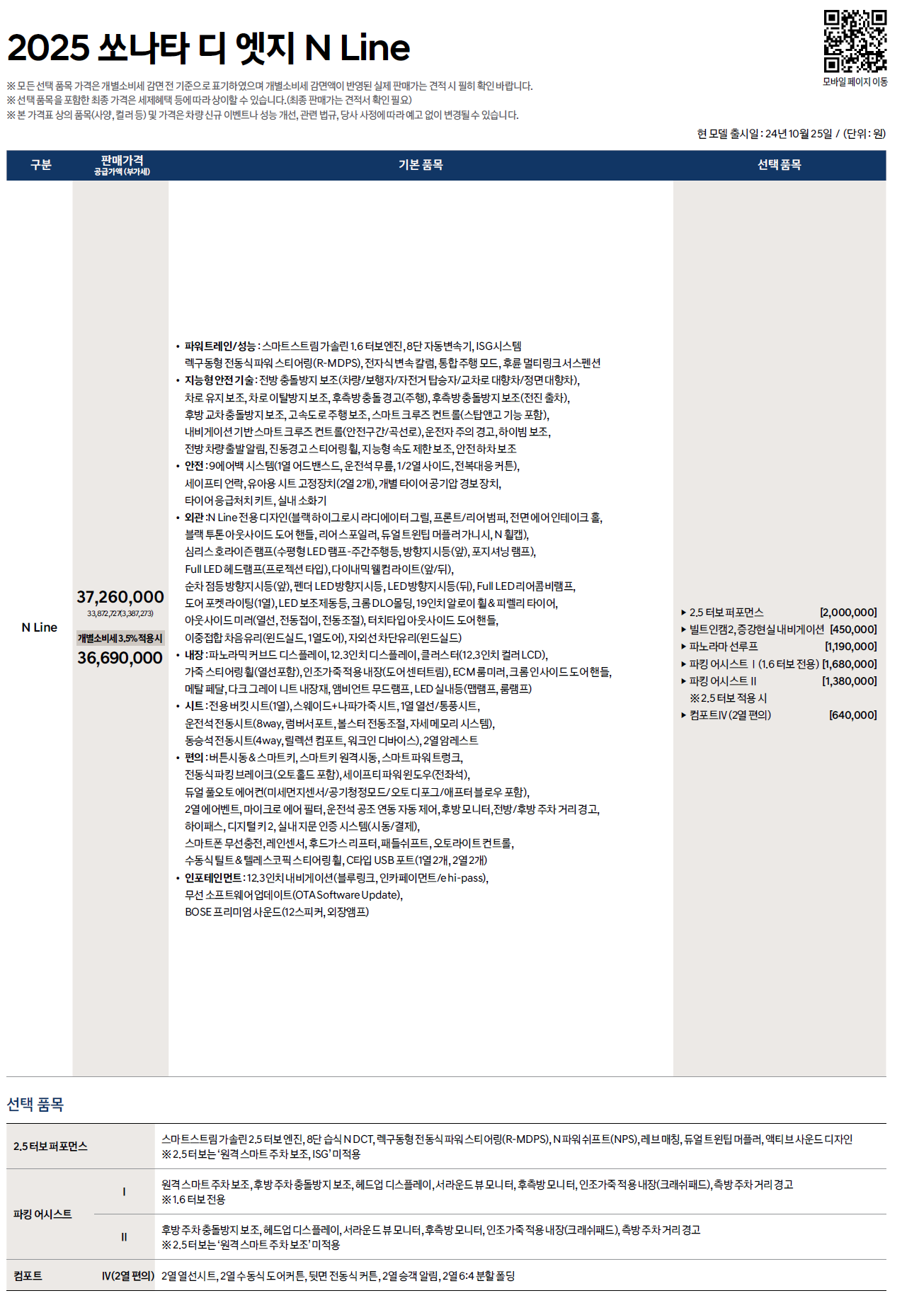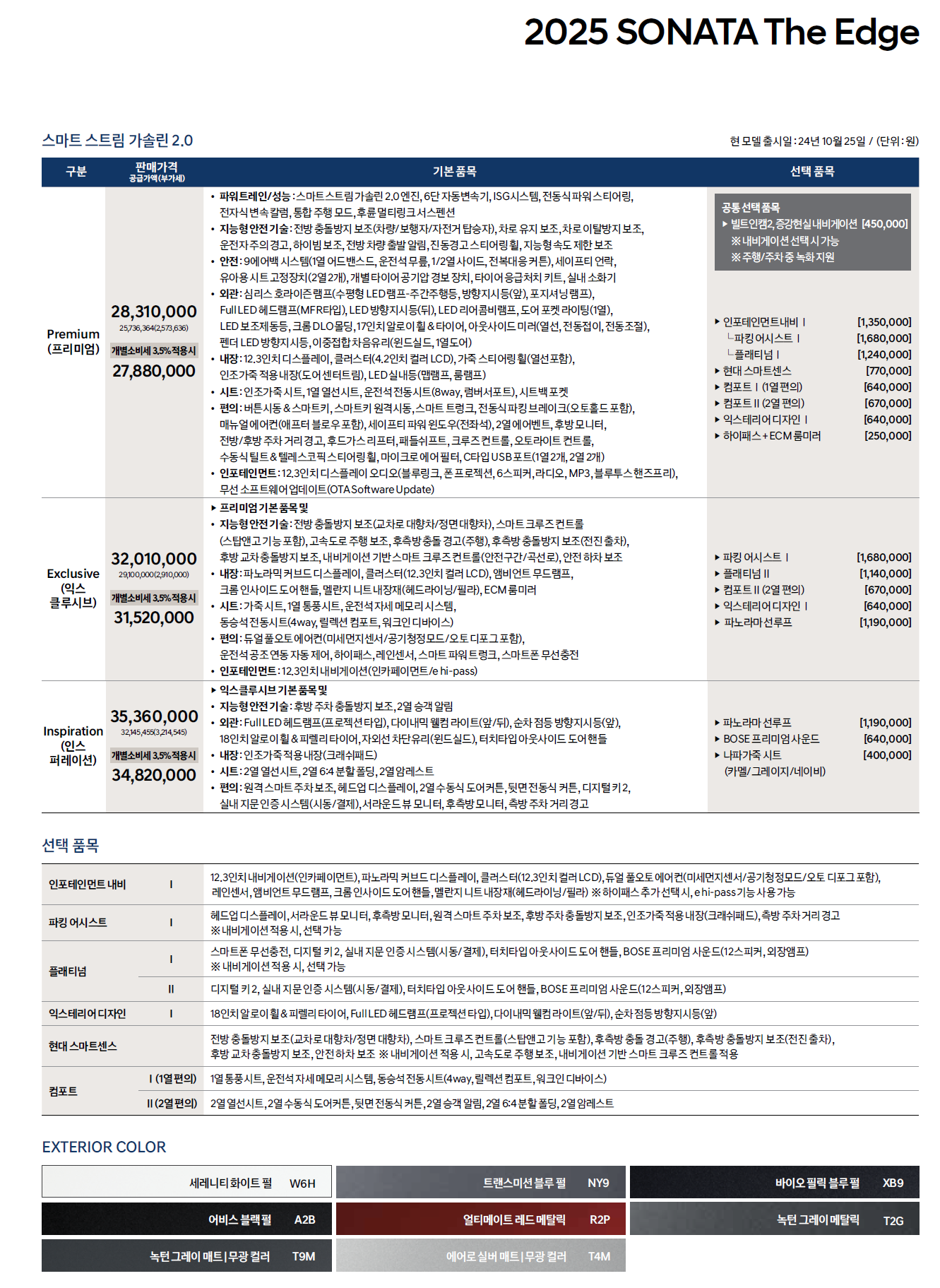 <2025년 현대 쏘나타 디 엣지 카탈로그 및 가격표 및 옵션>