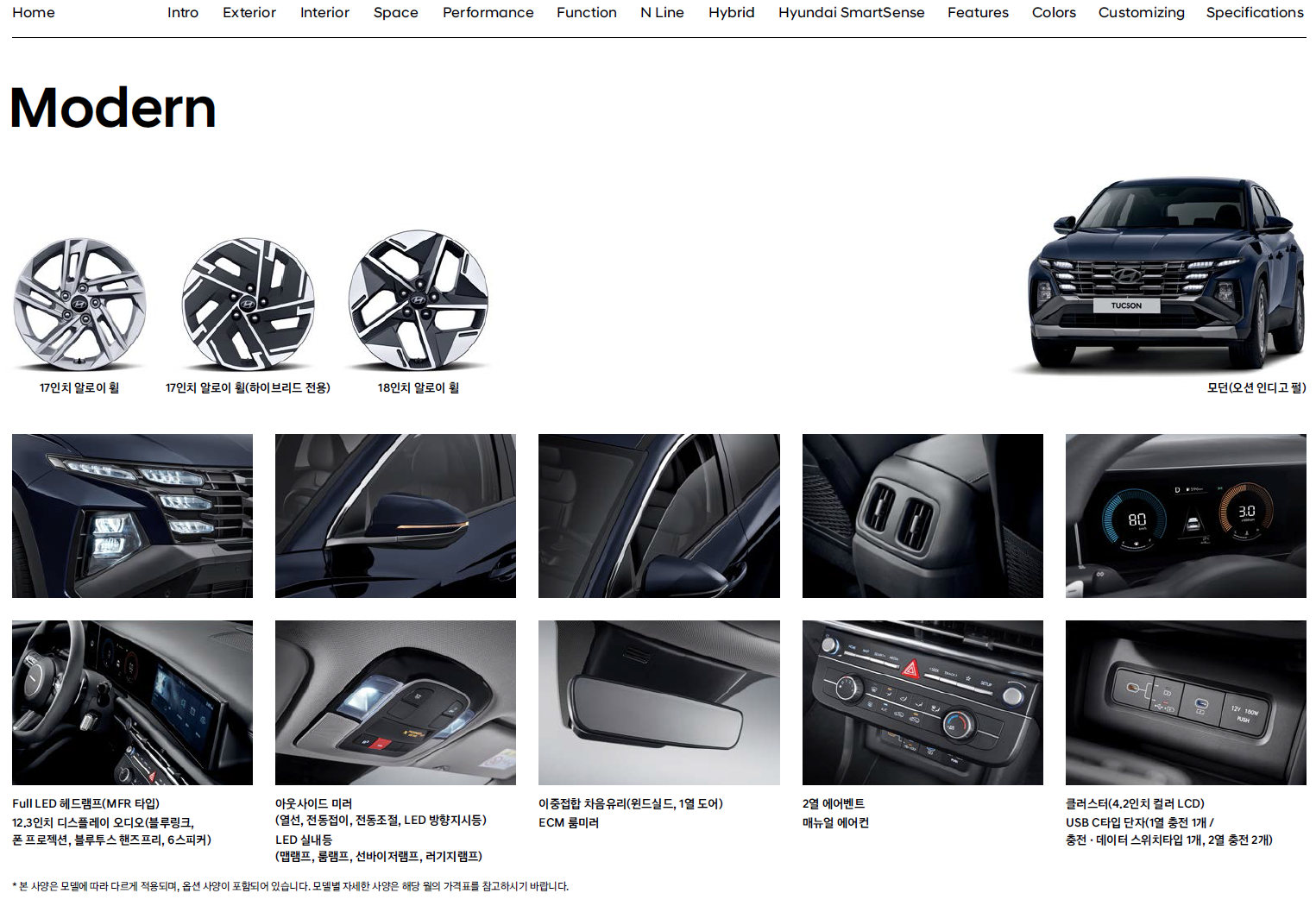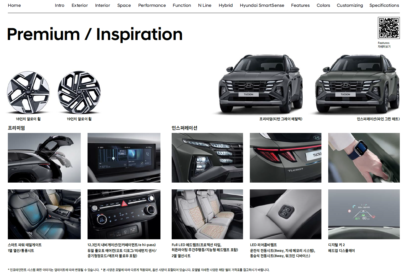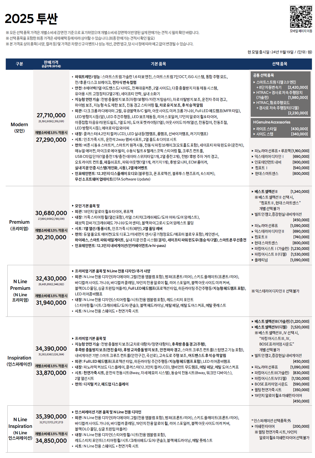 <2025년 현대 투싼 카탈로그 및 가격표 및 옵션>