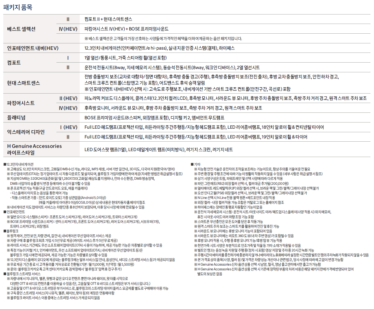 | 인스퍼레이션 (최상위 트림) | 신규 옵션 패키지 '베스트 셀렉션 III/IV' 운영 | 고객 선호 사양(파킹 어시스트, BOSE 사운드 등)을 묶어 할인된 가격으로 제공 |